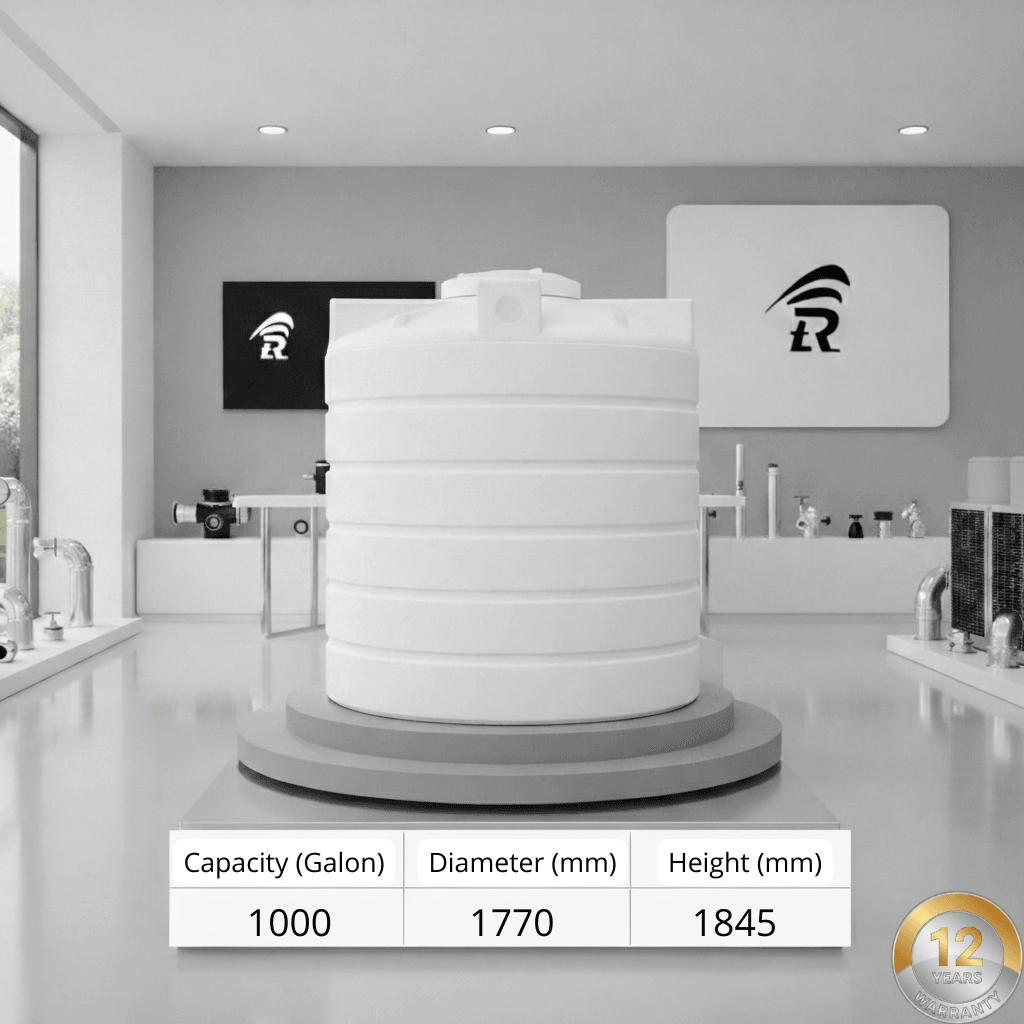 هذا الحجم مناسب للبيوت الصغيرة، الاستراحات، والمشروعات المؤقتة. يوفر 1000 جالون كمية كافية من المياه لتلبية احتياجات أسرة متوسطة لفترة جيدة، خصوصًا عند دمجه مع مضخة توزيع مناسبة وخطوط مدخل فلترة عند الحاجة.