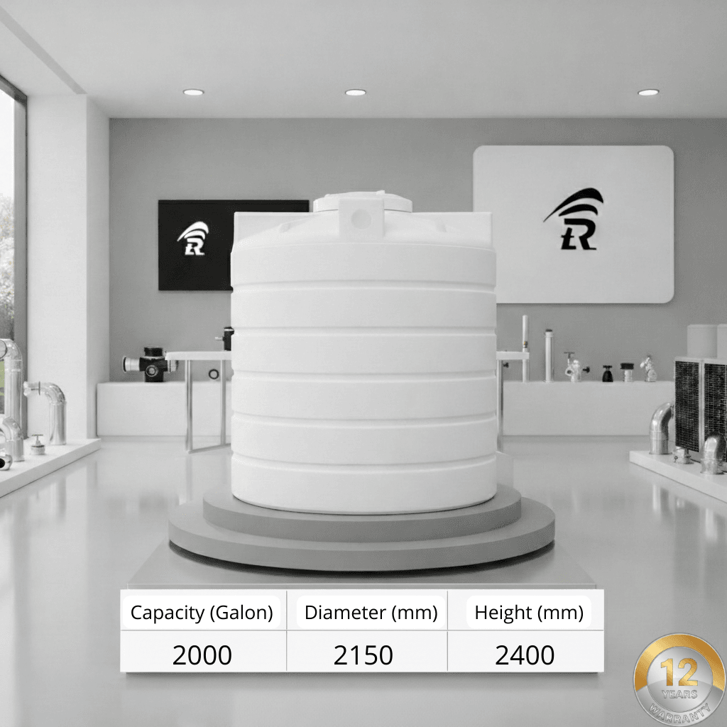 خزان بسعة 2000 جالون مُصمّم ليضمن تخزين مياه آمن وموثوق. مصنّع من بولي إيثيلين عالي الجودة (LLDPE) بطبقات متعددة تحمي المحتوى من العوامل الجوية وتُطيل عمر الخزان. هذا الحل مناسب لـ Residential and Commercial ويتميز بسهولة النقل والتركيب (حسب نوع القاعدة).